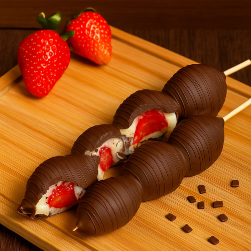 Chocolate ao leite nobre, bombons de morango e leite condensado